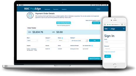 RBC PayEdge is an innovative platform that automates payments to suppliers by integrating with your accounts payable system. Enabling seamless payment and reconciliation, businesses of all sizes can save time and money, whether or not they’re an RBC banking client. With funds easily accessed from any Canadian bank account or credit card, RBC PayEdge makes it easy to pay suppliers anywhere.