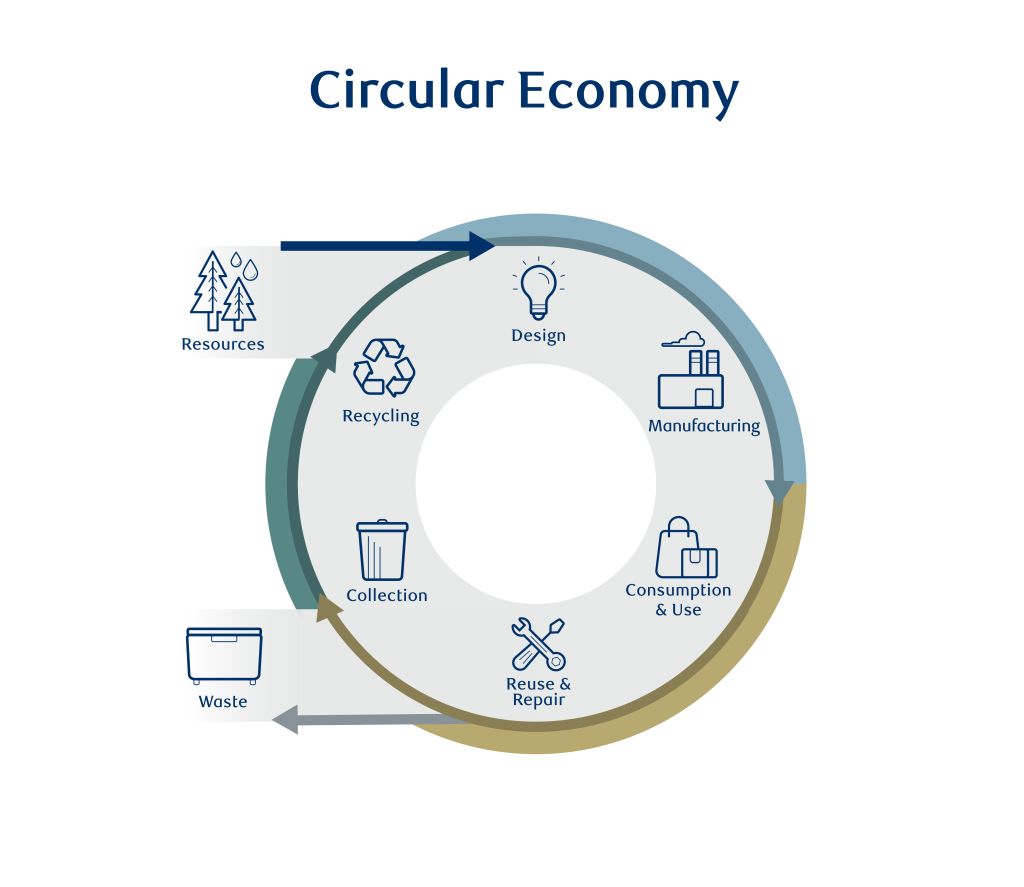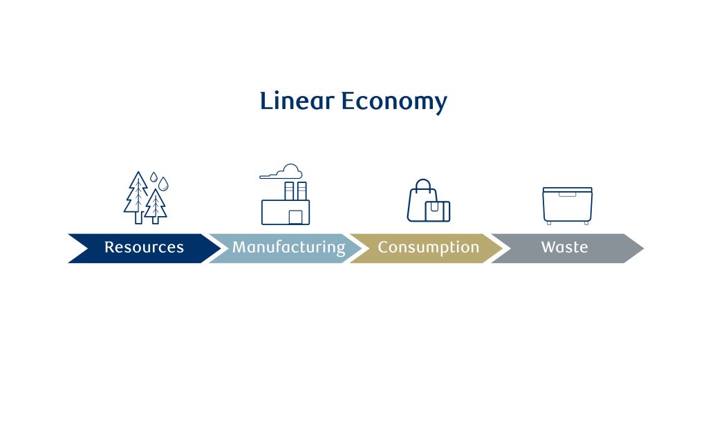The linear economy follows a “take-make-dispose” model: Raw materials are extracted, products are manufactured and sold, then sent to landfill once they’ve served their purpose.