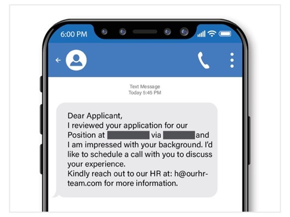 You receive an unsolicited message from someone claiming to be a recruiter from a company or employment agency. The sender promotes a flexible position with minimal work hours and a high salary. The message prompts you to click a link or reply, further engaging you to provide confidential information or download malicious software onto your device.