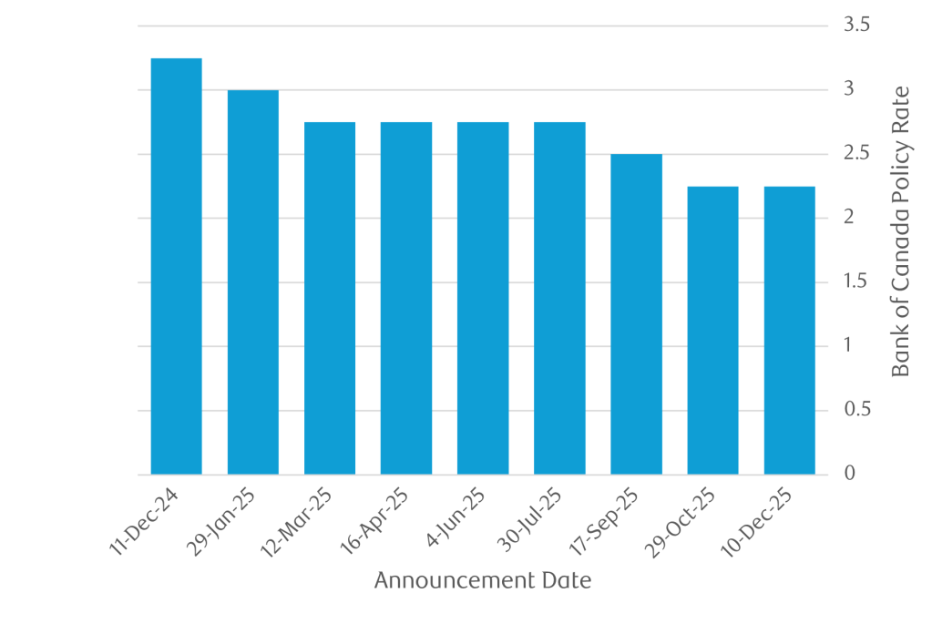 On December 10, 2025, the Bank of Canada announced that it is holding its interest rate at 2.25%.
