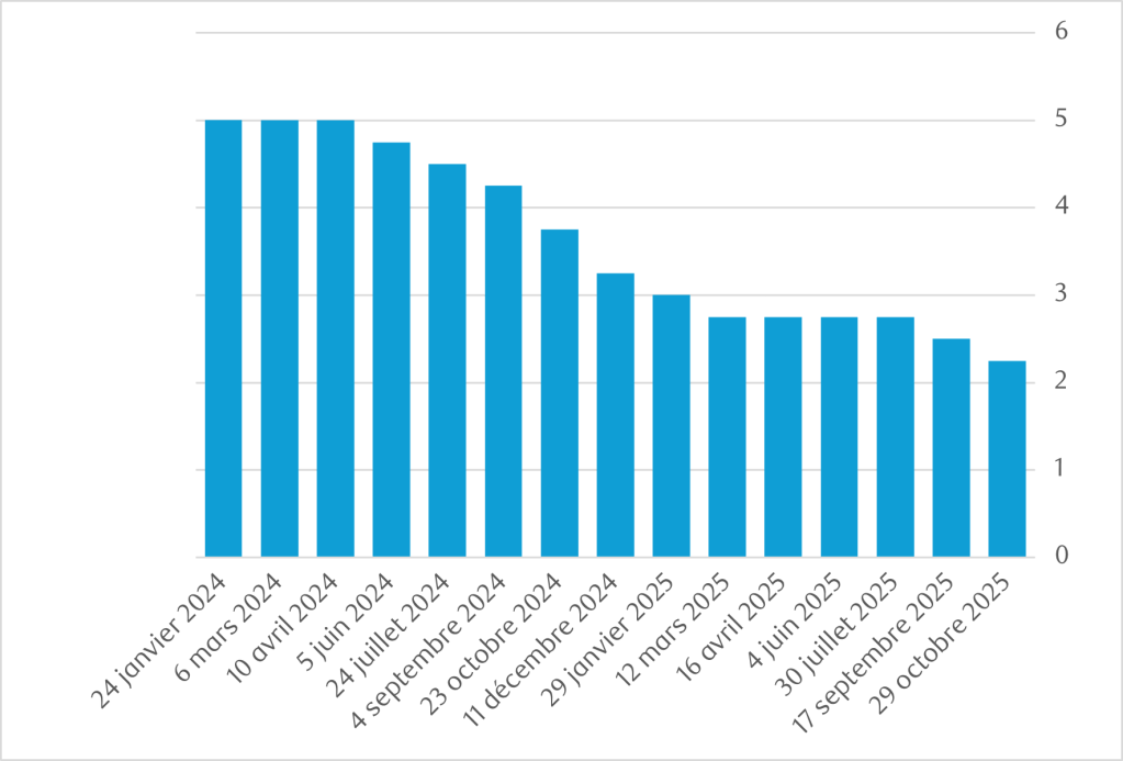 Dernière mise à jour : Le 29 octobre 2025, la Banque du Canada a annoncé qu’elle abaissait son taux directeur à 2,25 %