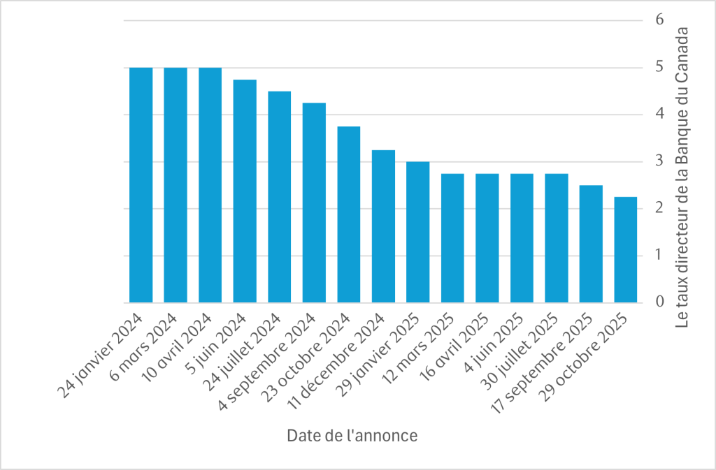 Dernière mise à jour : Le 29 octobre 2025, la Banque du Canada a annoncé qu’elle abaissait son taux directeur à 2,25 %